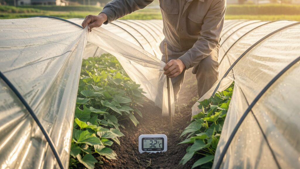 まず温度管理についてです。春先の天気は変わりやすく、晴れた日の日中は気温が急上昇します。保温のためにビニールトンネルやホットキャップ、あるいは衣装ケースなどで覆っている場合、直射日光が当たると内部の温度はあっという間に上昇します。もし内部が50℃を超えてしまうと、植物の細胞タンパク質が変性し、種芋がいわゆる「煮えた」状態になって死滅・腐敗します。人間が「今日は暖かいな」と感じる日は、トンネル内は灼熱地獄かもしれません。日中はトンネルの裾を開けて換気をする、不織布などの通気性のある素材に変えるなど、こまめな温度調整が不可欠です。地温計を刺して、常にチェックする癖をつけると安心ですね。