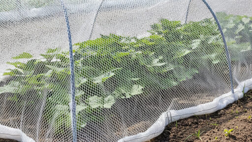 伏せ込みを行ったら、すぐに目合い0.6mm〜0.8mm程度の防虫ネットで育苗スペース全体をトンネル状に覆ってしまいましょう。1mmの網目だと小さなアブラムシやアザミウマがすり抜けてしまうことがあるので、より細かい網目のものが安心です。これは害虫の侵入を防ぐだけでなく、強風や急激な乾燥、あるいは遅霜から苗を守るシェルターとしての役割も果たします。水やりもネットの上からできるので、管理も楽ですよ。