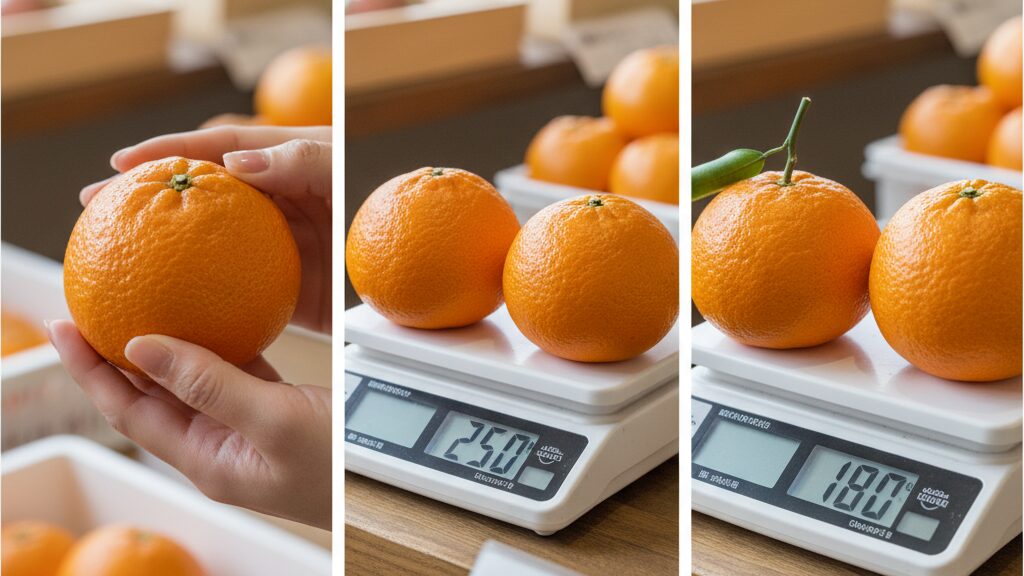 次に、いくつかのせとかを優しく手に取って、その重さを比べてみてください。見た目の大きさが同じくらいであれば、ずっしりと重みを感じる方がおすすめです。重さは、果汁がどれだけ豊富に含まれているかのバロメーター。重いものほど、みずみずしくジューシーな果肉が詰まっている証拠です。