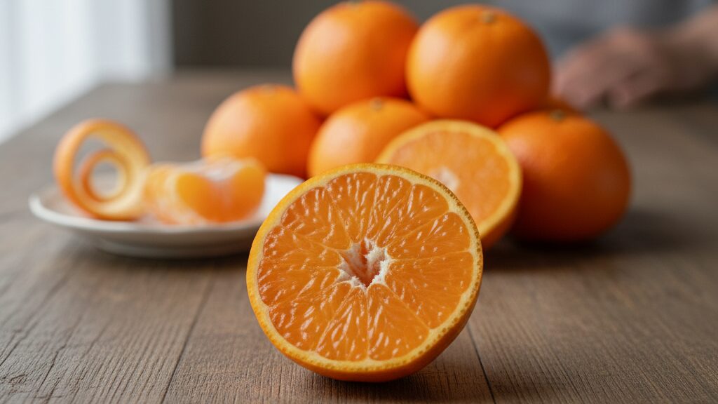 まず最も重要なのが皮の状態です。果皮全体が濃く鮮やかなオレンジ色に染まっていて、色むらがないものを選びましょう。そして、表面にはパンとしたハリと、美しいツヤがあるものが新鮮な証拠です。皮の表面にあるブツブツとした「油胞(ゆほう)」が細かく、均一に広がっているものほど、きめ細やかな果肉で美味しい傾向にあります。逆に、皮にシワが寄っていたり、フカフカと柔らかい「浮き皮」の状態になっているものは避けましょう。