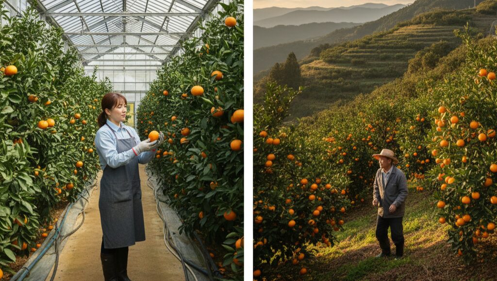 前述の通り、せとかの収穫時期は「露地栽培」か「ハウス栽培」かによって変わります。この二つの栽培方法は、単に収穫タイミングが異なるだけでなく、それぞれにメリット・デメリットがあり、果実の個性にも影響を与えます。