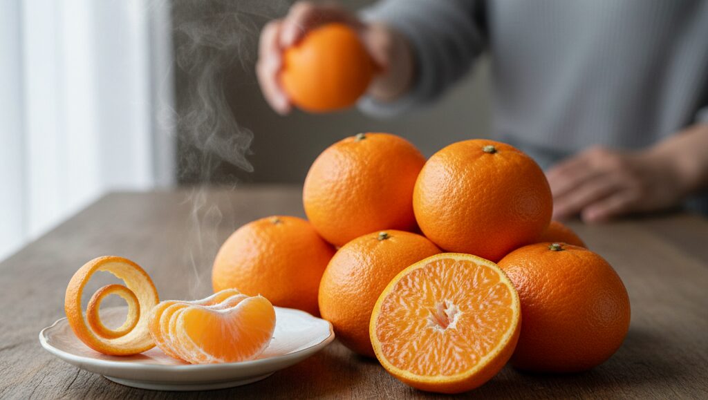 まず最も重要なのが皮の状態です。果皮全体が濃く鮮やかなオレンジ色に染まっていて、色むらがないものを選びましょう。そして、表面にはパンとしたハリと、美しいツヤがあるものが新鮮な証拠です。皮の表面にあるブツブツとした「油胞(ゆほう)」が細かく、均一に広がっているものほど、きめ細やかな果肉で美味しい傾向にあります。逆に、皮にシワが寄っていたり、フカフカと柔らかい「浮き皮」の状態になっているものは避けましょう。