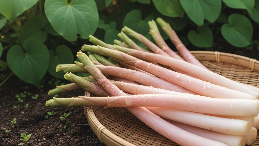 軟白栽培とは、ウドやホワイトアスパラガスの栽培でも用いられる技術で、植物が成長する過程で意図的に日光を遮断し、葉緑素(クロロフィル)の生成を抑制することで、白く柔らかく育てる手法です。みょうがたけの場合、この方法を用いることで、えぐみが少なくなり、より繊細でマイルドな風味と、驚くほど柔らかい食感を実現できます。