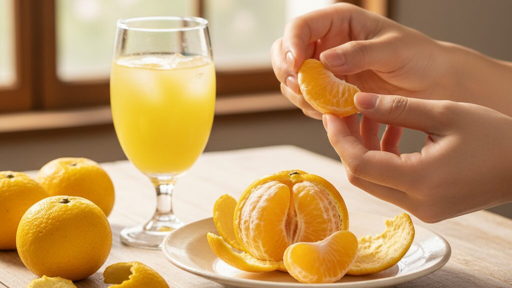 用途はもう「調味料」ではなく、完全に「フルーツ」です。ミカンのように皮をむいて、そのまま生食で食べるのが一番。皮も柔らかくなるので、本当にミカンのように手でむいて、そのままパクッと食べられるんですよ。