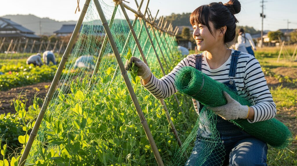 支柱を立てた後は、市販の園芸用ネットを張るのが最も簡単で効率的です。つるが自然に絡みついてくれるため、面倒な誘引の手間を大幅に省くことができます。もしネットがない場合は、20cm~30cm間隔で麻ひもなどを横に張って、つるが絡まる足場を何段も作ってあげましょう。