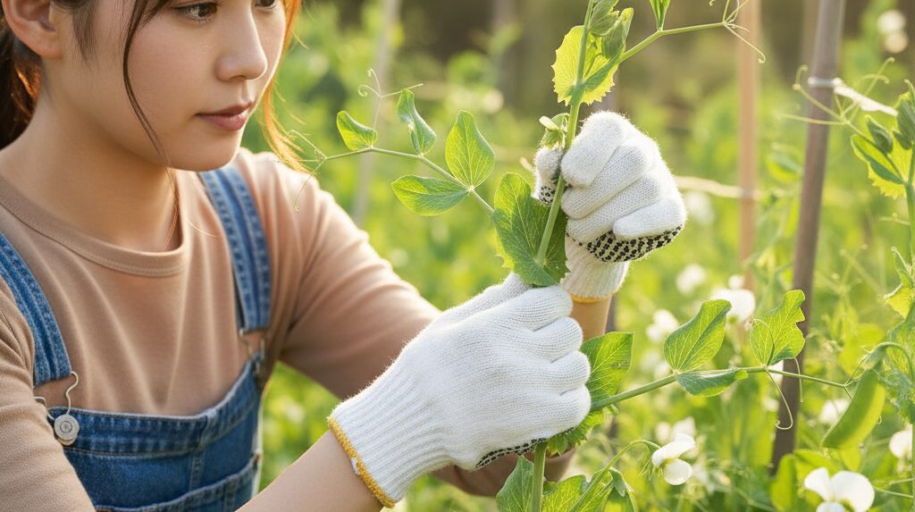 スナップエンドウの収穫量を飛躍的に増やすための、少し進んだ栽培テクニックが「摘心(てきしん)」です。摘心とは、つるの先端にある「成長点」を意図的に摘み取ることで、植物の成長をコントロールし、収量を最大化する伝統的な技術です。
