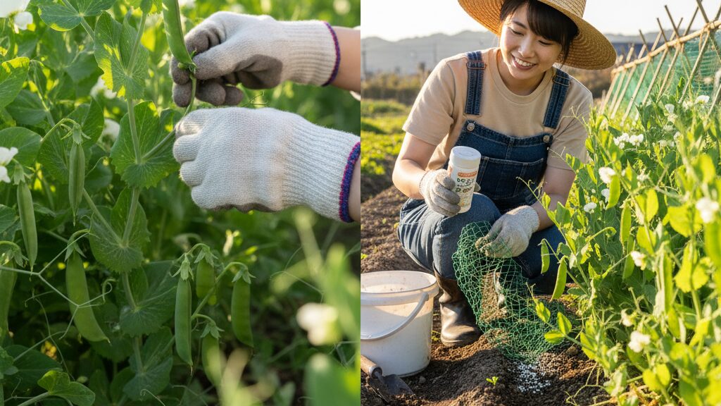 特に収穫が盛んになる最盛期は、可能であれば毎日畑やプランターをチェックするのがおすすめです。昨日までまだ小さいと思っていたさやが、暖かさと太陽の光を浴びて、一日で驚くほど立派な収穫サイズになっていることもよくありますよ!