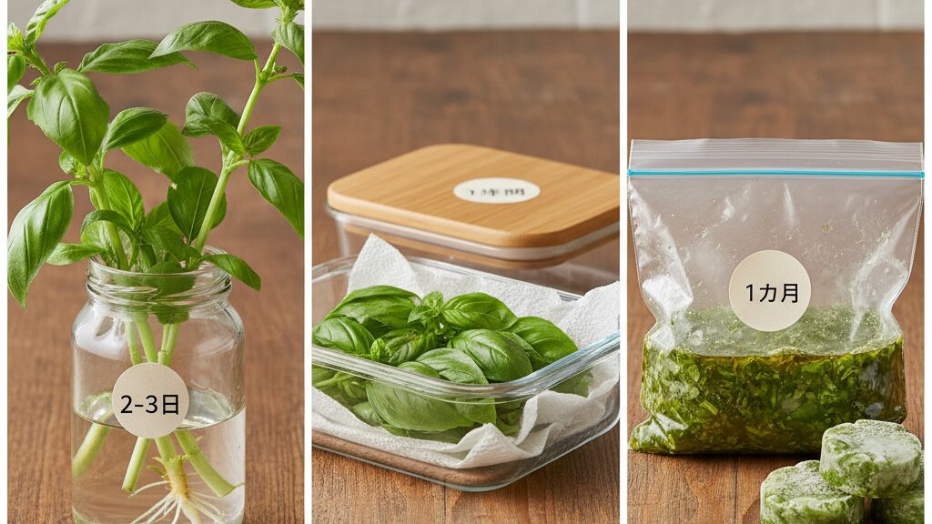 | 加工(バジルペースト) | 冷凍で約1カ月 | ◎(濃厚) | △(ペースト状) | ジェノベーゼ、万能ソース |