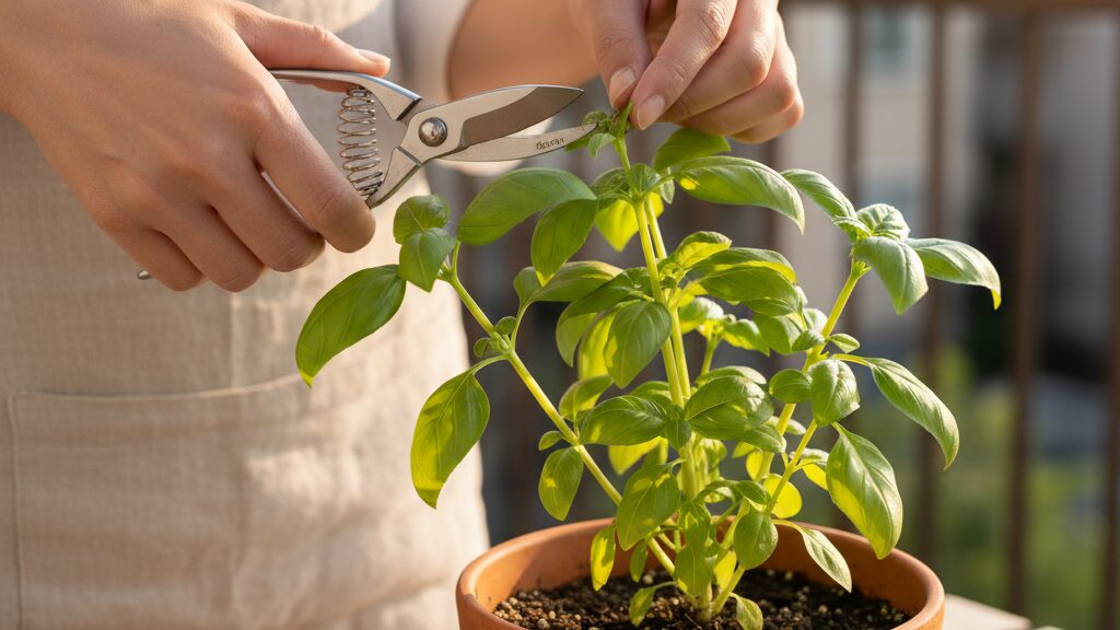 「料理の飾りに1〜2枚だけ欲しい」という場合は、手で葉を摘み取ることもありますが、これは株の成長を促す観点からは、持続的な収穫方法とは言えません。バジルの収穫の基本は、常に「茎ごとカット」です。