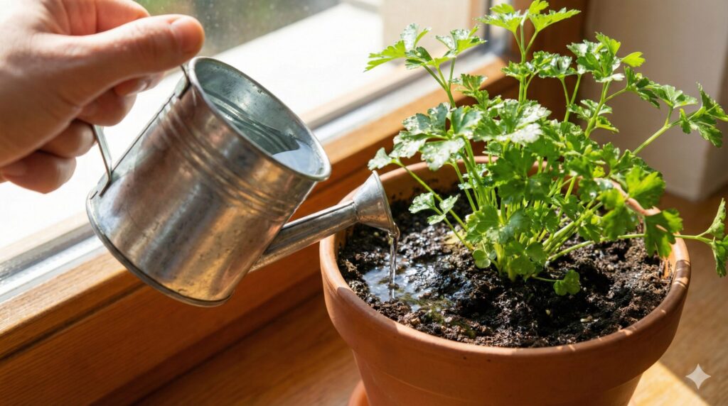 冬の水やりは、パセリ栽培において最もテクニックを要する作業です。夏場のように毎日決まった時間にたっぷり……というやり方は、冬には「根腐れ」の特急券になってしまいます。気温が低いと土の中の水分がなかなか蒸発しないため、見た目は乾いていても中がジメジメしていることが多いんですね。基本は「土の表面が白っぽく乾いてから2〜3日後」くらいの慎重さでちょうどいいです。頻度の目安としては、環境によりますが週に1〜2回程度になることも珍しくありません。
