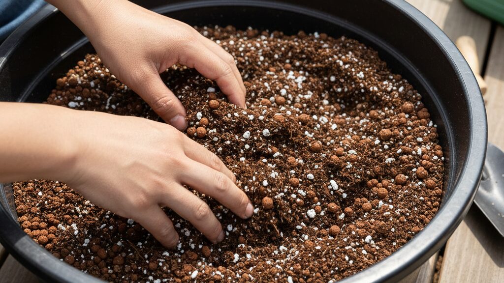 市販の「花と野菜の土」をそのまま使うのは、パパイヤの越冬用としては少し水持ちが良すぎる(水はけが悪すぎる)場合があります。そこで私は、市販の培養土をベースにしつつ、排水性を高める資材を多めにブレンドすることをおすすめしています。
