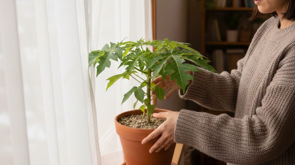 家の中でどこに置くかも、パパイヤの運命を左右します。基本的には日当たりの良い南向きの窓辺がベストポジションであることに間違いはありません。太陽の光は植物を温め、体力を維持するために不可欠だからです。