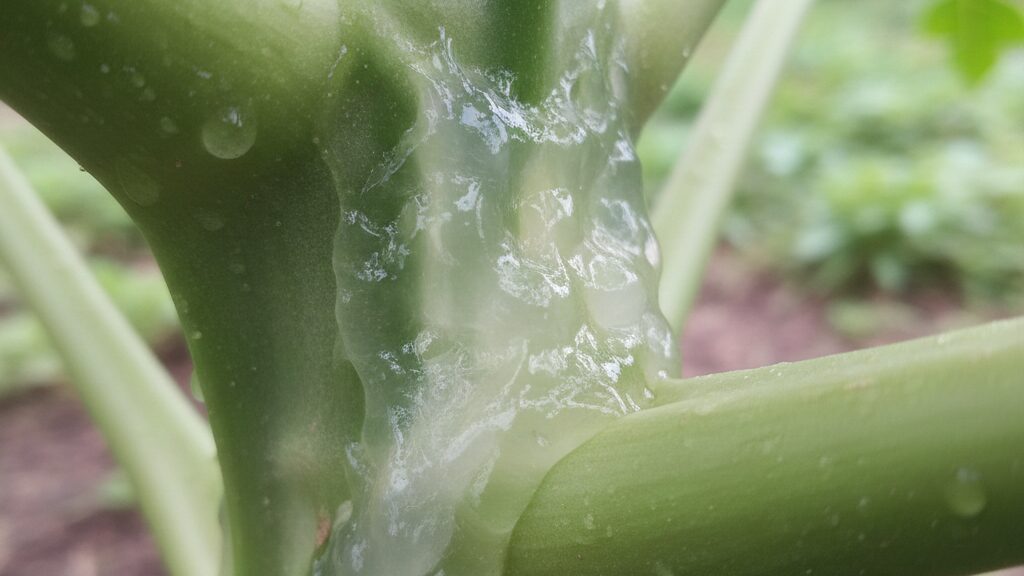 冬越しに失敗したパパイヤで最もショッキングなのが、「朝起きたら茎が半透明になっていて、触るとぶよぶよに崩れてしまった」というケースです。これは病気というよりも物理的な現象で、寒さによって細胞の中の水分が凍り、その体積膨張で細胞膜が内側から破裂してしまった状態、いわゆる「凍害」です。