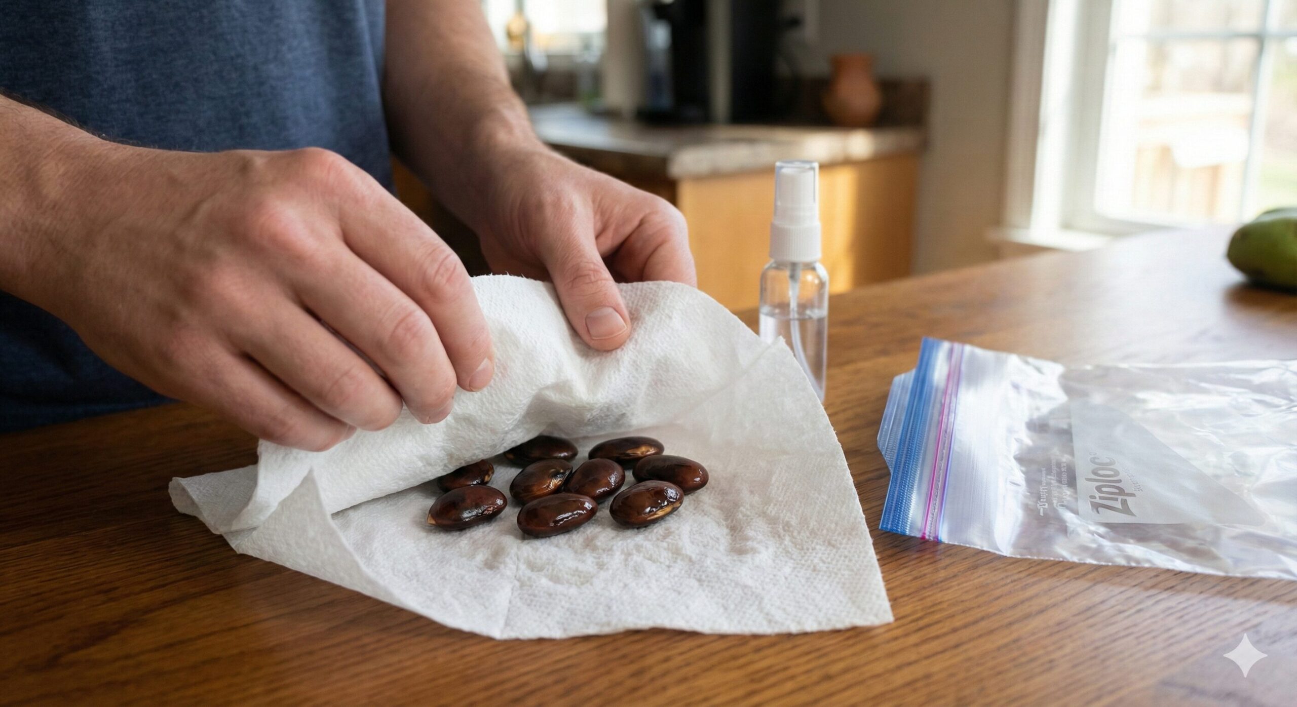 では、どうすれば良いのでしょうか。食べた直後に種をよく水洗いし、周りのヌルヌルした果肉をきれいに落とします。果肉が残っているとカビの原因になるので、ここは丁寧に行いましょう。洗った種は、すぐに水を含ませたキッチンペーパーやミズゴケで包みます。そして、それをジップロックなどの密閉できる袋に入れます。