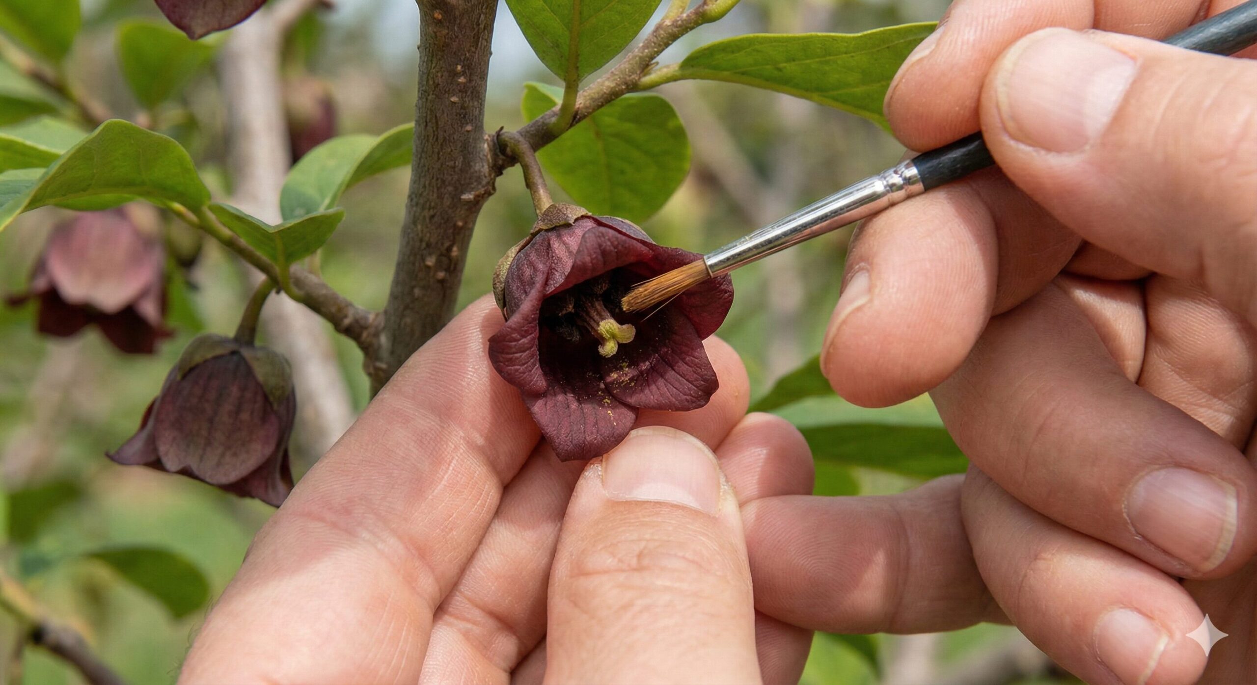 さらに、ポポーの花は独特の腐肉臭(イースト菌のような匂い)を出し、ハエや甲虫を呼び寄せて受粉しますが、日本の住宅地ではこれらの虫が十分に働いてくれないことも多いです。そこで、人間が筆や綿棒を使って花粉を運んであげる「人工授粉」を行うことで、結実率は劇的に向上します。茶色くなった花から花粉を取り、咲いたばかりの緑色の雌しべにつけてあげる作業は、まるで科学実験のようで楽しいですよ。