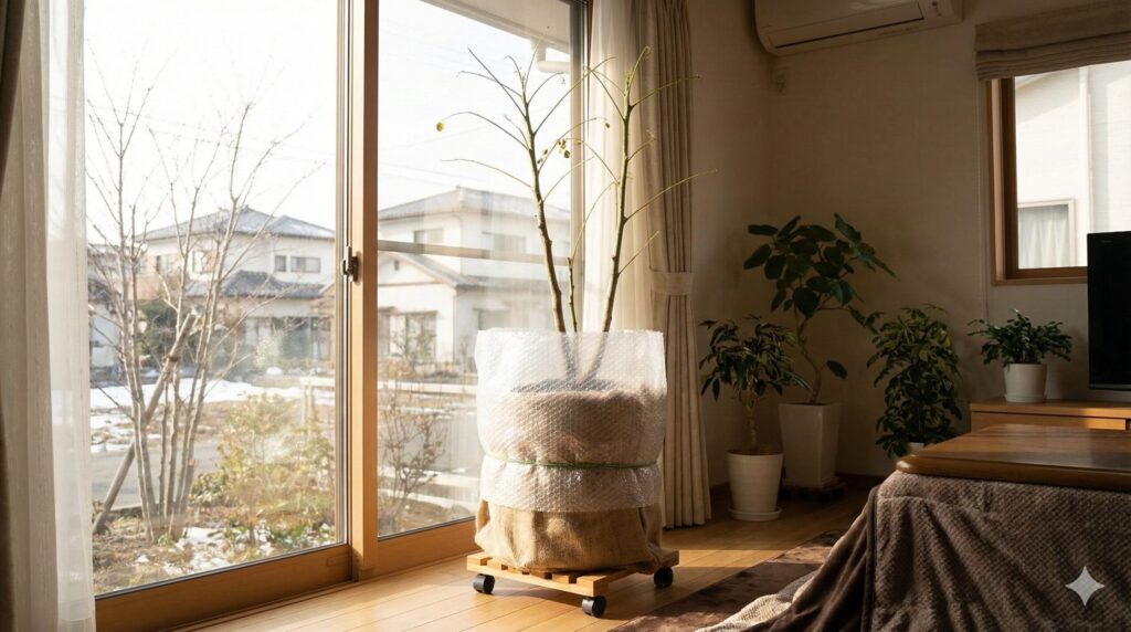 冬越しを成功させるためには、最低でも室温を10℃以上、できれば15℃程度に保てる場所に移動させることが絶対条件です。日当たりの良い窓辺がベストポジションですが、夜間の窓際は「放射冷却」で外気並みに冷え込むことがあるので注意してください。夜だけはお部屋の中央に移動させるか、鉢を段ボールに入れたり、プチプチ(緩衝材)で鉢ごと包んだりして、土の温度が下がらないように工夫してあげましょう。また、エアコンの風が直接当たると、今度は乾燥しすぎて幹がシワシワになってしまうため、直接当たらない場所を選んでくださいね。