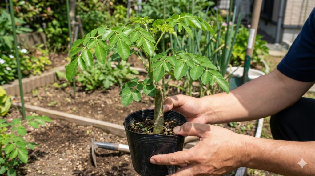 ここが最も注意してほしいポイントなのですが、モリンガは「直根性(ちょっこんせい)」といって、根がゴボウのように真っ直ぐ深く伸びる性質を持っています。このメインの太い根を傷つけてしまうと、植物全体に大きなダメージを与え、最悪の場合はそのまま枯れてしまうんです。そのため、植え替え(鉢増し)をする際は、ポットから苗を抜くときに決して根鉢(根と土の塊)を崩さないようにしてください。そっと包み込むように持ち、用意した新しい鉢や地面に、元の高さと同じ深さで据えてあげるのがコツです。