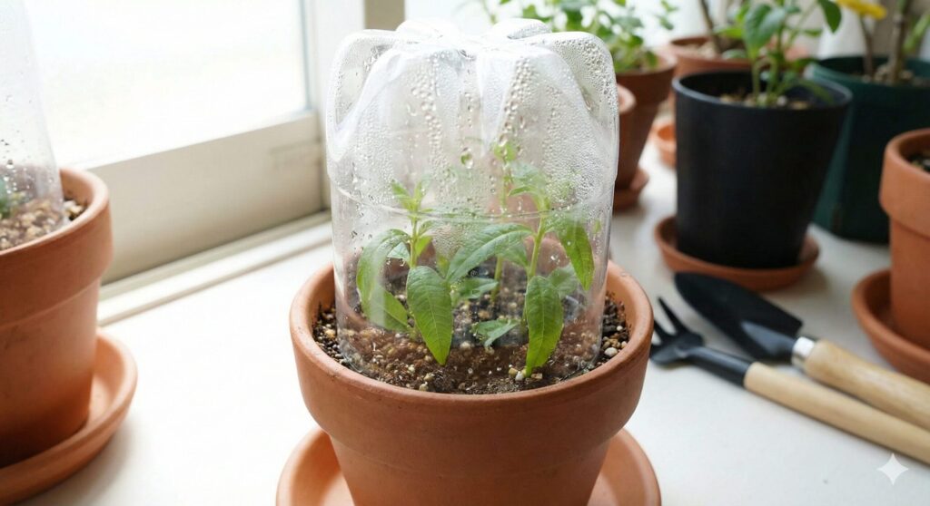 私がもっとも推奨しているのが、ペットボトルや衣装ケースを使った「密閉挿し」です。挿し床に挿し穂を刺した後、上からカバーをかけて容器内の湿度を100%近くに保ちます。まだ根を持たない挿し穂にとって、葉からの水分損失は死に直結しますが、この方法なら物理的にそれを防げます。直射日光を避けた明るい日陰に置き、2〜3週間ほど静置すれば、節のあたりから白い根が確認できるようになります。根がしっかり回ったのを確認してから鉢上げしましょう。挿し木などの繁殖技術については、学術的な知見も非常に参考になります。正確な植物生理に基づいた増殖法を確認したい方は、公的機関の資料(出典:独立行政法人 農業・食品産業技術総合研究機構(農研機構)『ハーブの繁殖技術と栽培法に関する研究』)をチェックしてみることをおすすめします。※やや古い資料ですが、植物生理の基本原理は現在も有効です。
