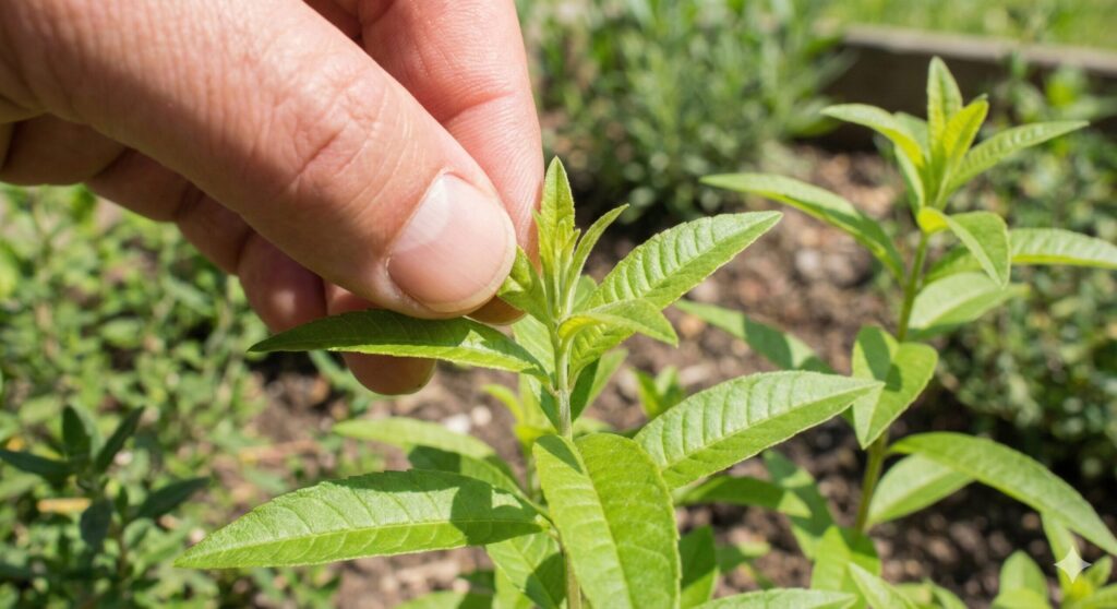 苗の植え付け後、樹高が20〜30cm程度に達したら、勇気を持って主軸の先端を数センチ摘み取りましょう。これを「摘心」と呼びます。先端を失ったレモンバーベナは、生き残るために下の節から新しい芽を左右に2本出そうとします。その新芽がまた10cmほど伸びたら、さらにその先端を摘みます。このプロセスを2〜3回繰り返すだけで、枝の数は幾何学的に増え、気づけば葉が密集した立派な株へと変貌します。早い段階でのこのひと手間が、秋の収穫量に直結します。摘み取った先端の葉も、もちろんフレッシュなハーブティーとして楽しめます。