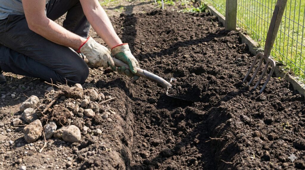 つまり、綺麗なまっすぐの人参を作るための最大のコツは、徹底した「深耕(しんこう)」と「砕土(さいど)」にあります。まずは、少なくとも30cm程度の深さまでしっかりと土を掘り起こし、出てきた石や前作の残渣(古い根っこなど)を取り除いてください。その後、土の塊を細かく砕いて、フカフカの状態にしてあげることが大切です。この一手間が、人参の育て方で初心者が直面する「見た目の失敗」を防ぐ最も確実な方法になります。また、土壌の酸度(pH)も重要で、人参はpH5.5〜6.5の弱酸性を好みます。日本の土壌は酸性に傾きがちなので、種まきの2週間以上前には苦土石灰を混ぜて調整しておきましょう。