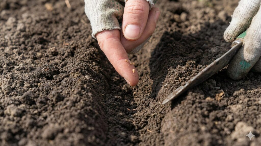 人参栽培において、最も緊張し、かつ最も重要なステップが「種まき」です。「人参は発芽さえすれば7割成功」と言われるほど、ここが最大の難所になります。人参の種が他の野菜と違う最大の特徴は、発芽に光を必要とする「好光性(こうこうせい)種子」であるということ。これを理解しているかどうかが、初心者の人参の育て方の運命を分けます。光が届かないほど深く埋めてしまうと、種はいつまで経っても眠りから覚めず、結局土の中で腐って芽が出ない、という結果になってしまうんです。