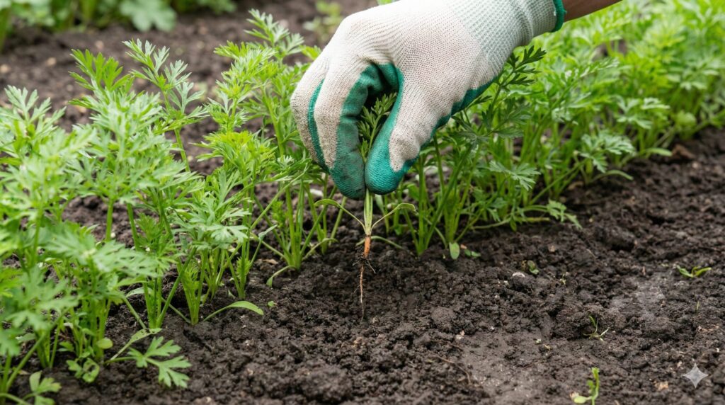間引きは通常、2回に分けて行います。1回目は、本葉が2〜3枚になった頃。隣の苗と葉が触れ合うくらいを目安に、株間を3cm程度にします。2回目は、本葉が5〜6枚になった頃。この時に最終的な株間を決定し、五寸人参なら10〜12cm、ミニ人参なら7〜10cmほどの間隔を確保しましょう。間引く対象は、成長が遅いもの、葉の色が悪いもの、逆に異常に成長が早すぎるものなどです。残す株の根を傷めないよう、抜く方の根元を指で押さえながら、まっすぐ上に引き抜くのがポイントです。