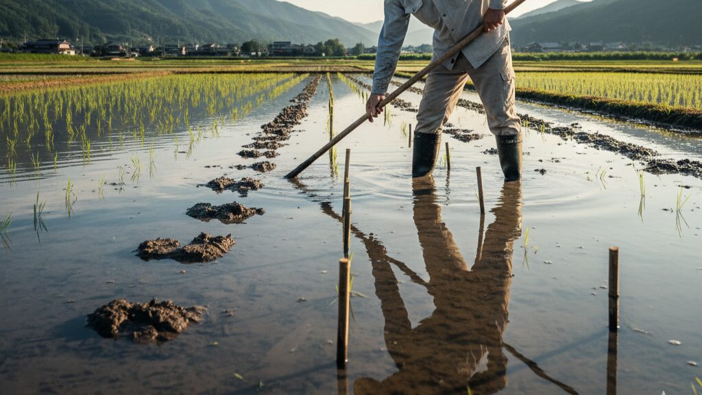 - 静置と観察:圃場全体に水が行き渡ったら、一度入水を止め、風や波が収まるまでしばらく待ちます。水面が鏡のように静かになったら、圃場全体を見渡せる畦の上などから、じっくりと状態を観察します。