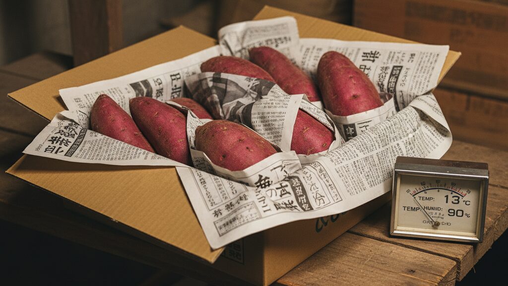 ご家庭では、新聞紙で包んだ芋を段ボール箱に入れ、暖房や直射日光の影響を受けない涼しい室内(冬場の床下収納や、北側の廊下など)で保管するのが簡単でおすすめの方法です。