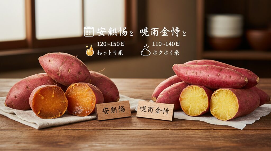 安納芋 | 9月下旬~12月上旬 | 120日~150日 | ねっとり系 | 追熟が甘さを引き出す鍵。濃厚な甘みが特徴。 |