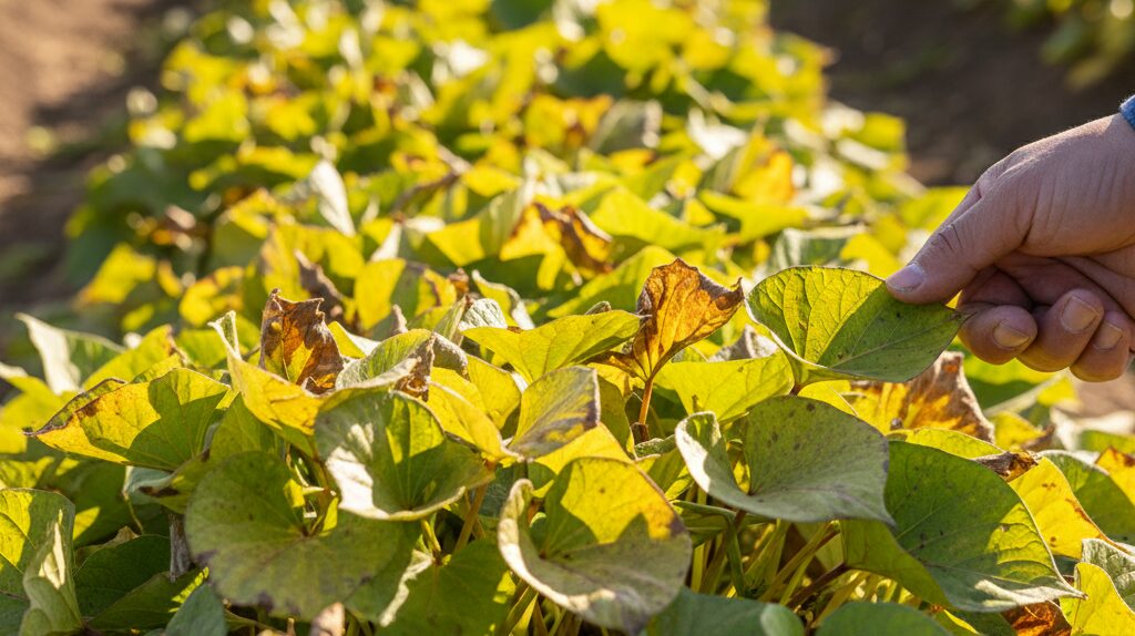 栽培日数の計算と並行して必ず確認したいのが、地上部の葉や茎が発する収穫サインです。植物は正直なもので、土の中の状態を地上部の姿で教えてくれます。サツマイモは、地中の芋が十分に肥大し、でんぷんの蓄積が完了に近づくと、光合成を行う葉への栄養供給を徐々に減らしていきます。この変化が、私たちにとっての収穫の合図となるのです。