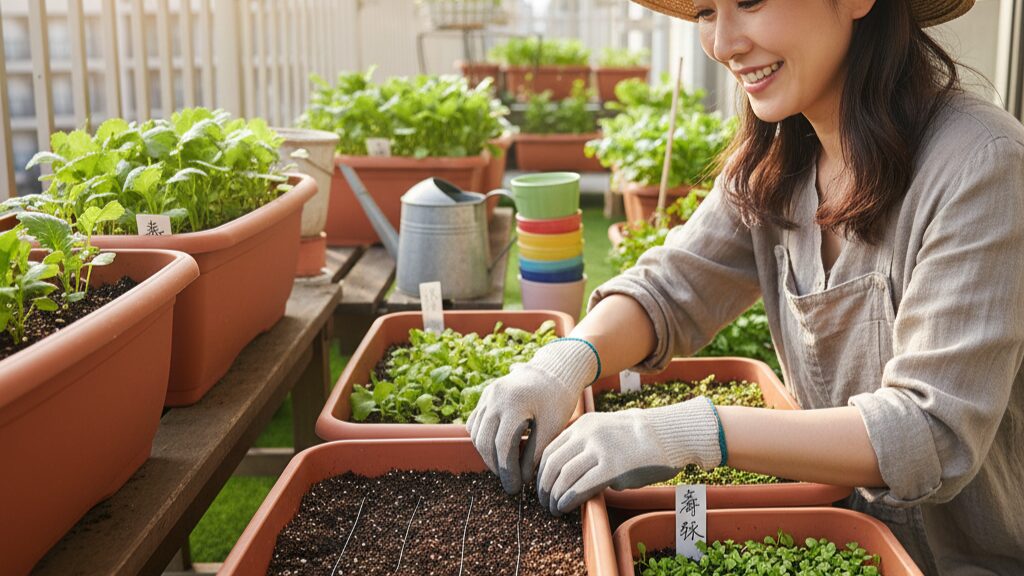 種まきの方法は、プランターの土に深さ1cm程度の溝を10cm~15cm間隔で作り、そこに種が重ならないように1cm間隔で丁寧に「すじまき」します。春菊の種は発芽に光を必要とする「好光性種子」なので、土を厚く被せすぎないのが最大のポイントです。種が隠れるか隠れないか程度のごく薄い土をかけ、手のひらで軽く押さえて土と種を密着させます。最後に、ジョウロなどで優しくたっぷりと水やりをすれば完了です。発芽までは約1週間から10日ほどかかりますが、その間は土の表面が乾かないように、こまめな水やりを心がけてください。