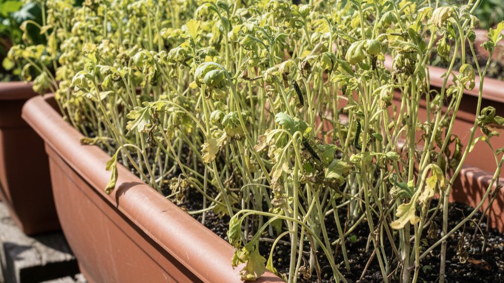 最も大きな問題は、限られたプランターのスペースと土の中の栄養を、過密状態の苗が一斉に奪い合うことです。その結果、どの株も十分に栄養を吸収することができず、全体的にひょろひょろと上にばかり伸びる「徒長(とちょう)」状態の弱々しい株になってしまいます。葉も小さく色つやが悪く、茎も細いため、本来の春菊の風味や食感を持つ収穫物は期待できません。
