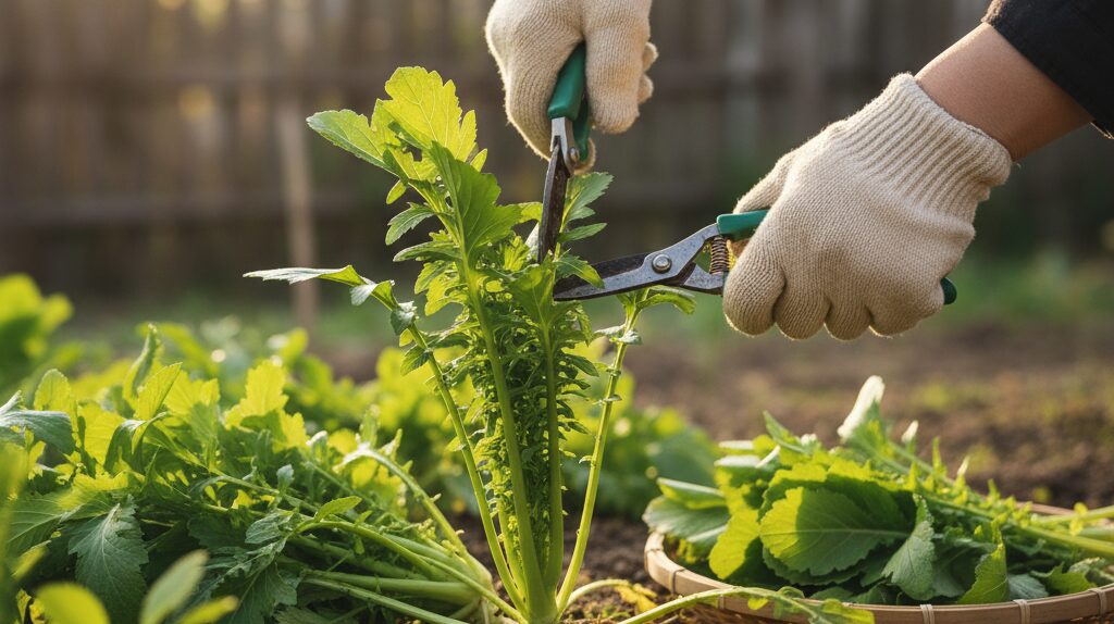 前述の通り、春菊は摘み取った茎の葉の付け根(葉腋)から、新しい「わき芽」を伸ばして再生するという性質を持っています。そのため、収穫する際には必ず下に数枚の葉と茎を残すことが絶対的な条件です。この葉が、次のわき芽を育てるための「工場」の役割を果たします。もし間違って全ての葉を根元から刈り取ってしまうと、新しい芽が出る場所がなくなり、その株は光合成もできずに再生不能となってしまいます。