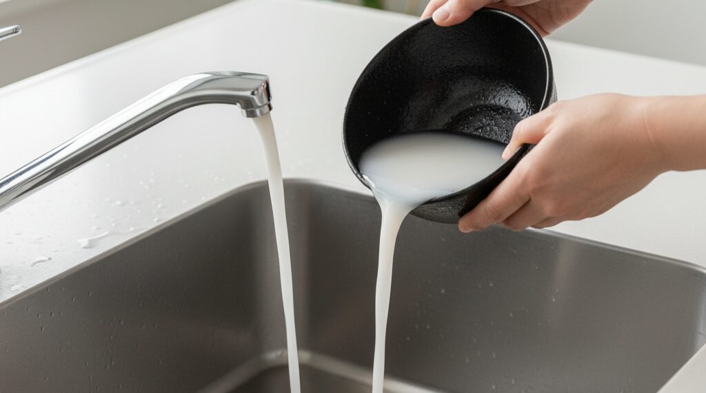 研ぎ終わったら、また水を入れて軽く混ぜて水を捨てる「すすぎ」を、2〜3回繰り返します。ここで、水が完全に透明になるまで、何度も何度もすすぎ過ぎるのも良くありません。