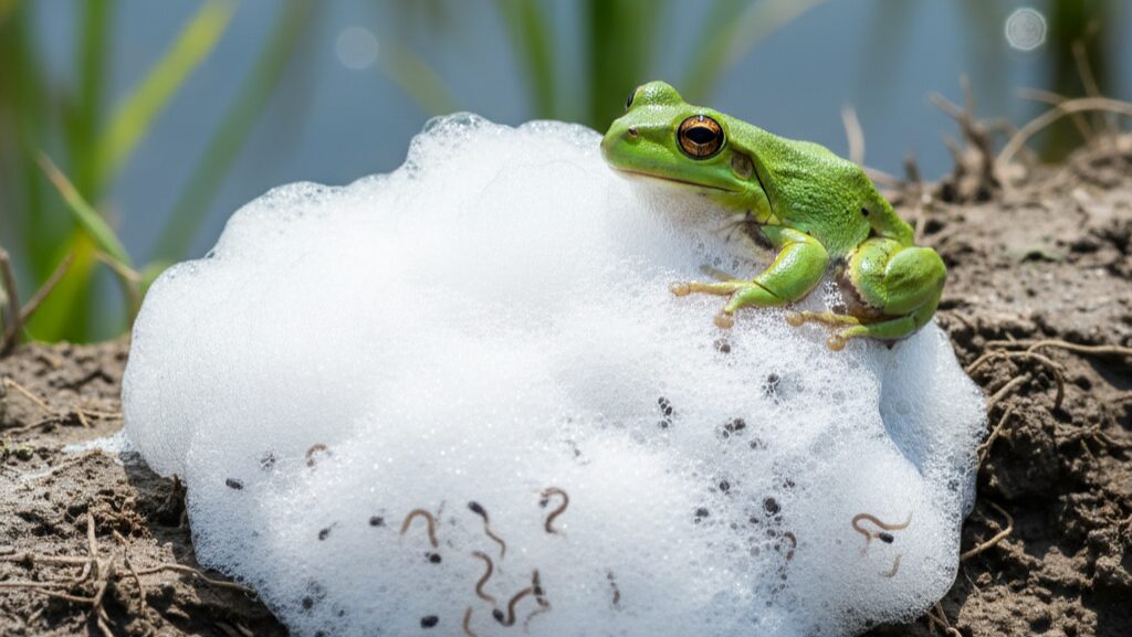 繁殖期になると、メスは水田の畦(あぜ)や水辺の土の中にオスと一緒に穴を掘って、その中にマシュマロや石鹸の泡のような、白くてふわふわの泡に包まれた卵(卵塊:らんかい)を産み付けます。私も田んぼの畦でこれを見つけた時は、「なんだこれ?」と本当にびっくりしました。