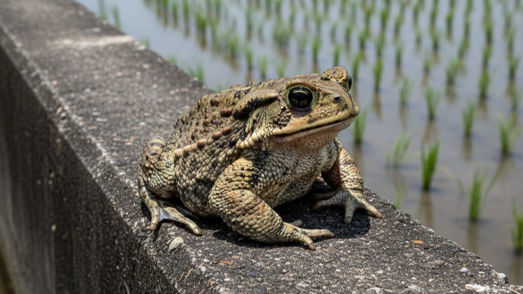 田んぼそのものよりは、周辺の草地や人家の庭などで見かけることが多いですが、ヒキガエル(アズマヒキガエルやニホンヒキガエル)には特に注意が必要です。