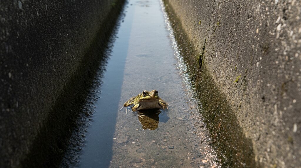 ある実験では、ニホンアカガエルはトウキョウダルマガエルよりも水路からの脱出率が高かったことが示されています。さらに、トウキョウダルマガエルは「体長の大きな個体」ほど脱出率が低いという結果も出ており、コンクリート水路がカエルの移動や生息を物理的に分断し、阻害していることがわかります。