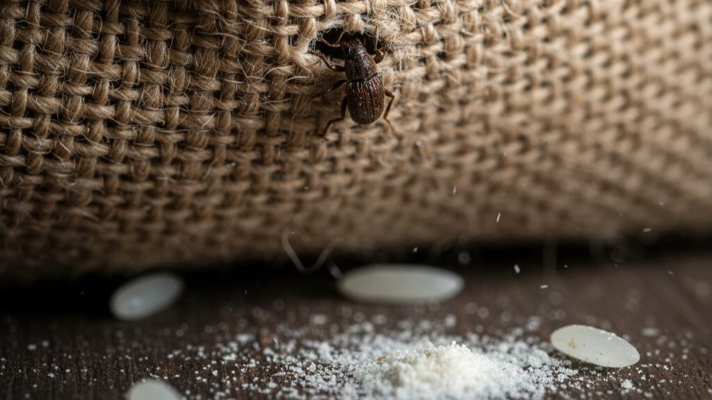 この穴は空気だけでなく、湿気やニオイ、そして最悪の場合は虫の侵入口にもなってしまいます。特に「コクゾウムシ」などの小さな虫は、このピンホールから侵入したり、強力な顎で袋を食い破って入ってきたりすることもあるんです。また、精米前の段階で既に卵が産み付けられているケースも稀にあり、室温が上がると孵化することもあります。「未開封=安全」とは限らない、ということをまずは知っておいてくださいね。