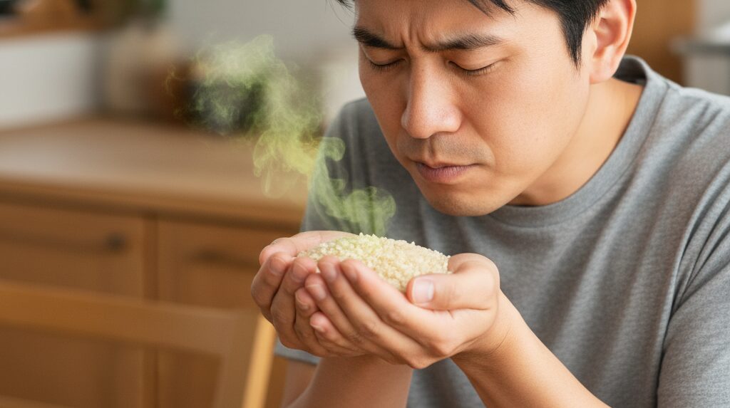「古米臭」と呼ばれる独特のニオイは、お米に残ったぬかの油分が酸化したもので、古い油のような、あるいはロウソクのようなニオイと表現されることもあります。体に害があるわけではありませんが、そのまま炊くと美味しくない原因になります。一方で、明らかに鼻をつくような酸味のある異臭がする場合は、危険信号ですので迷わず処分しましょう。