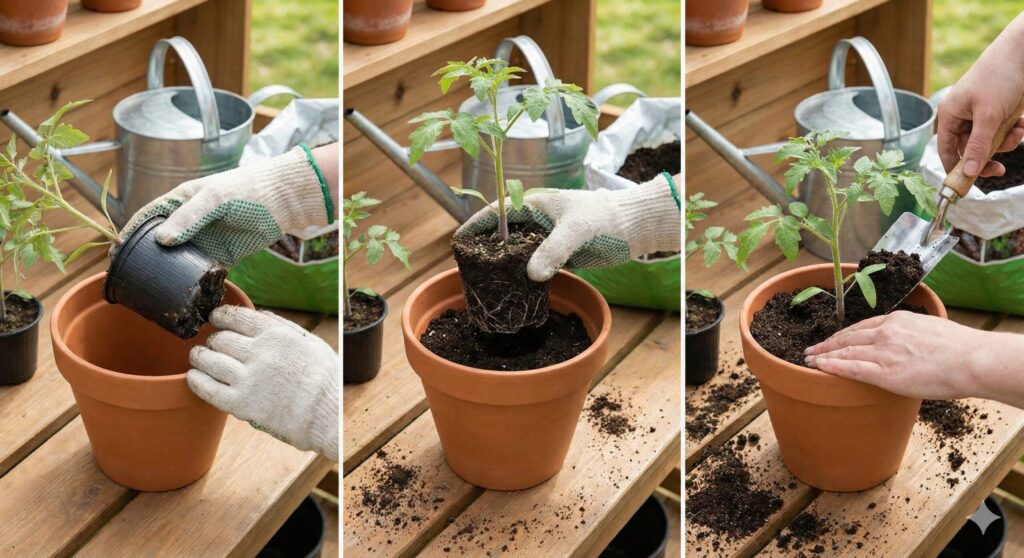 3. 苗をポットから抜き、根を崩さずにそのまま大きな鉢へ入れます。