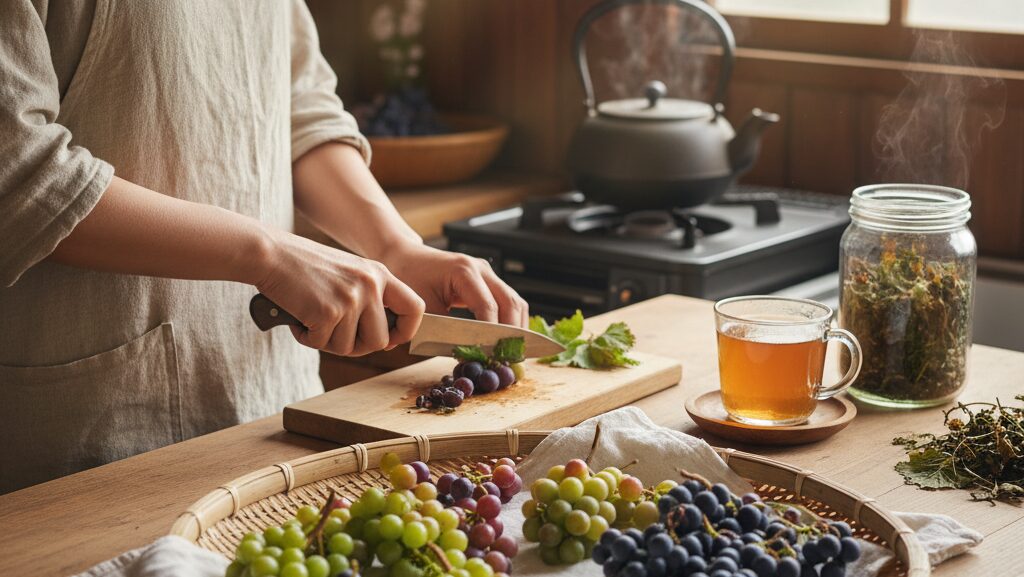 馬ぶどうを手に入れたら、最も手軽に始められる活用法が自家製の「馬ぶどう茶」です。手間ひまかけて自分で作ったお茶は、格別の味わいがあります。作り方は非常にシンプルで、特別な道具も必要ありません。実、葉、茎など、収穫した部位を無駄なく活用できます。