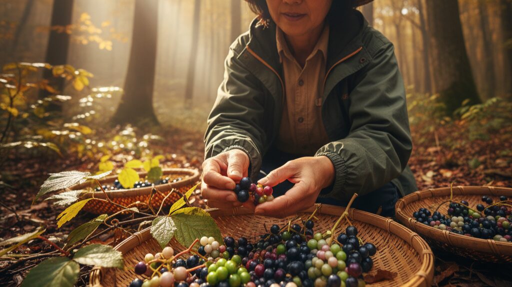 実の色は、未熟な淡い緑色から始まり、成熟が進むにつれて青紫、空色、瑠璃色、そして最終的に磁器のような白色へと変化していきます。一つの房にこれらの色が混在し、美しいグラデーションを描くため、どの段階で収穫すべきか迷うのは当然です。実は、この収穫タイミングについては、利用者の間でいくつかの考え方があり、目的によって最適な色が異なるとも言われています。