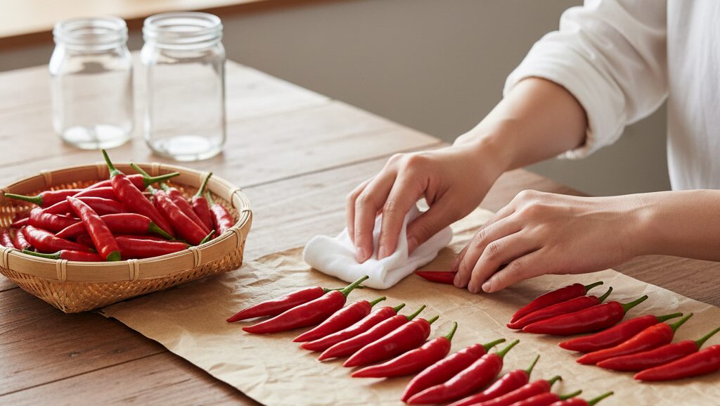 収穫した鷹の爪は、まず表面に付着した土やホコリを乾いた布で優しく拭き取ります。このとき、水洗いは避けてください。余計な水分を与えてしまい、乾燥を遅らせる原因になります。その後、風通しの良い日陰を見つけ、実が互いに重なり合わないように注意しながら、ザルや新聞紙の上に広げ、本格的な乾燥プロセスに入る前の下準備を始めます。