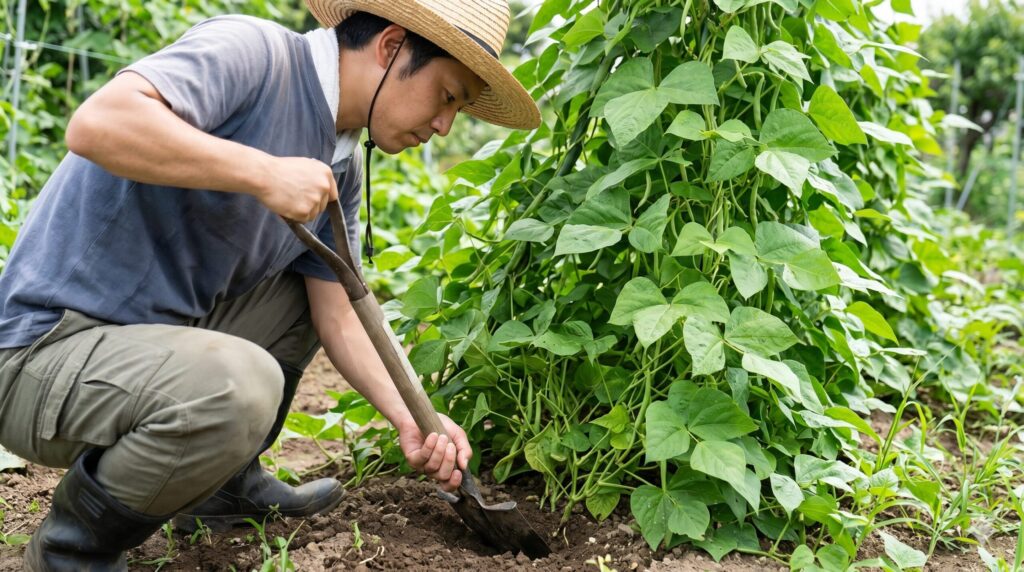 どれだけ良い肥料を与えても、根がそれを吸える状態でなければ意味がありません。連作障害が出やすいインゲンにとって、土の中の微生物バランスを整えることは多収穫の絶対条件です。私は元肥の段階から微生物資材を混ぜ込み、根が常に「生き生きと」呼吸できる環境を作るようにしています。根が健康であれば、摘心によるショックからの立ち直りも早く、夏場の高温期でもバテずに実をつけ続けてくれます。正確な施肥量については、お使いの土壌診断結果や自治体の栽培指針(出典:農林水産省「都道府県施肥基準等」)を確認しながら、自分の畑に最適な量を見極めてみてくださいね。