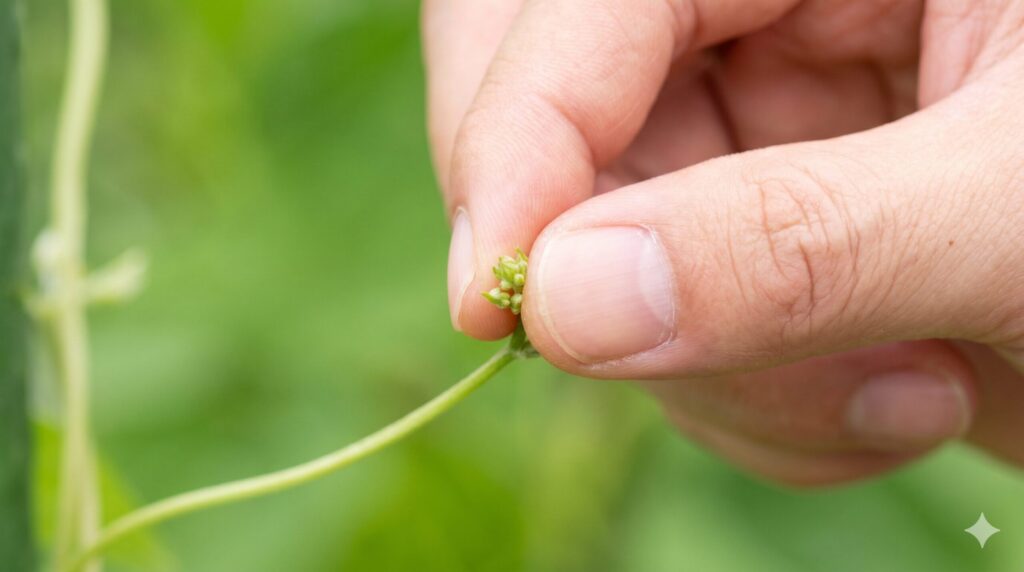 最も手軽なのは、高濃度のアルコールスプレーや、ウイルス除菌用のシートで刃先を拭くことです。より確実なのは、農業用の市販の園芸用消毒液(商品名:ビストロンなど)の溶液にハサミを浸す方法です。また、道具を使わずに「手で摘む」のも一つの知恵です。手であればハサミほど広範囲にウイルスを媒介するリスクが低く、つるの感触を確かめながら作業できるメリットもあります。ただし、手にも汁液はつくので、やはり株ごとの手洗いや消毒は欠かせません。