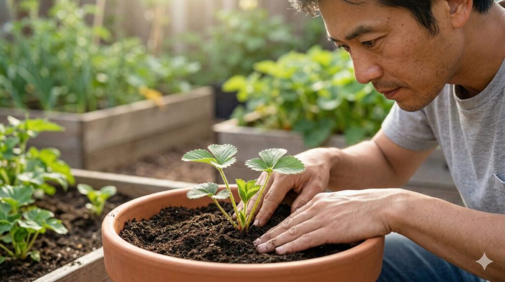 本葉が3〜5枚ほどに増え、苗がしっかりしてきたら、より大きなプランターや畑に植え替える「定植」の時期です。この時、収穫量や品質に差が出るポイントが植え付けの深さです。イチゴには、株の中心にある成長点(クラウン)という膨らんだ部分があります。ここが将来的に新しい葉や花が出てくる、いわば株の最も重要な部分。植え付けの際に、このクラウンを土に埋めてしまうと生育不良の原因になります。