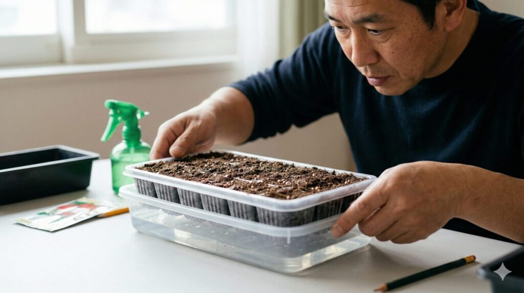 プランターも100均で自分好みのものを選んでみてください。サイズ選びのコツなどは100均プランターでイチゴ栽培を成功させる選び方で詳しく紹介しています。水やりには霧吹きを使いましょう。また、100均のキッチン用バットを受け皿にすれば、手軽に「底面給水」ができる環境が整います。土を湿らせた後、種をパラパラと表面に置き、トレイを明るい窓際に置けば準備完了です。こうした手近な道具からスタートできるのも、種からイチゴを育てる魅力の一つですよね。