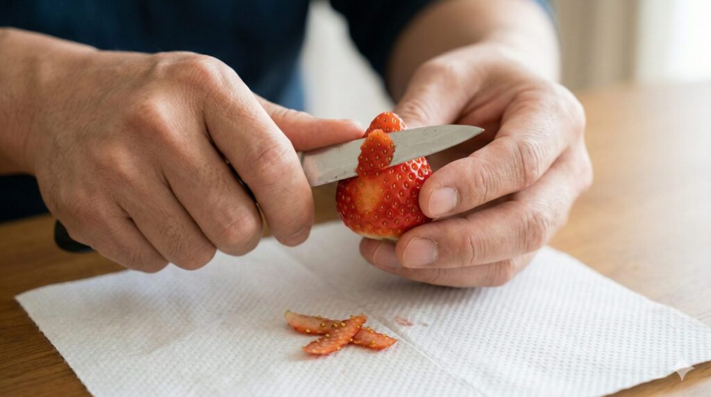 自分でイチゴの種を取る作業は、家庭菜園ならではの楽しみの一つですね。わが家でも、子供たちがイチゴを食べるときに「この粒々が赤ちゃんになるんだよ」と話しながら作業しています。まず、完熟したイチゴの実から種を採取しましょう。包丁で実の表面を1〜2mm程度の厚さで薄く削ぎ落とし、キッチンペーパーの上に重ならないよう広げます。そのまま風通しの良い日陰で2〜3日乾燥させてください。パリパリに乾いたら、指で優しく揉むだけでポロポロと種が外れます。この粒々は植物学的には「痩果(そうか)」と呼ばれる小さな果実であり、その内部に本当の種が包まれています。