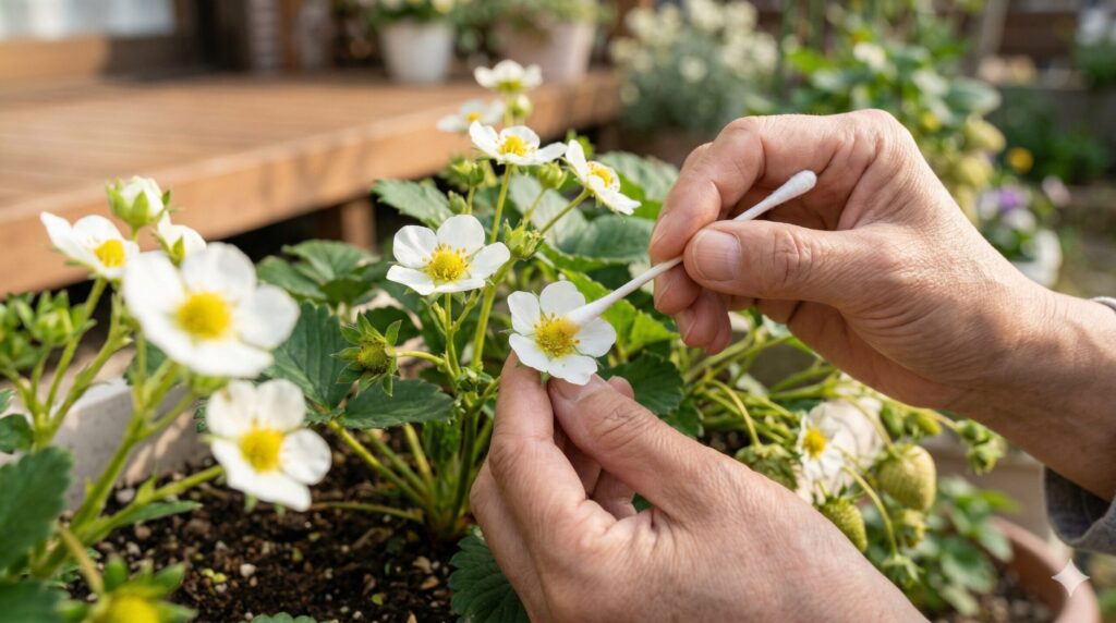 ようやく花が咲いたら、いよいよ最後の仕上げです。実を確実に大きくするためには「人工授粉」が欠かせません。開花後2〜3日間、1日1回程度、柔らかい筆や綿棒で花の中央を優しくなでてあげましょう。これで受粉が確実になり、形の良いイチゴが実ります。種からイチゴを育てる方法は、正しい手順を押さえれば初心者でも成功できます。確かに時間はかかりますが、自分の手で小さな種から立派な実を作るプロセスは、何物にも代えがたい喜びです。