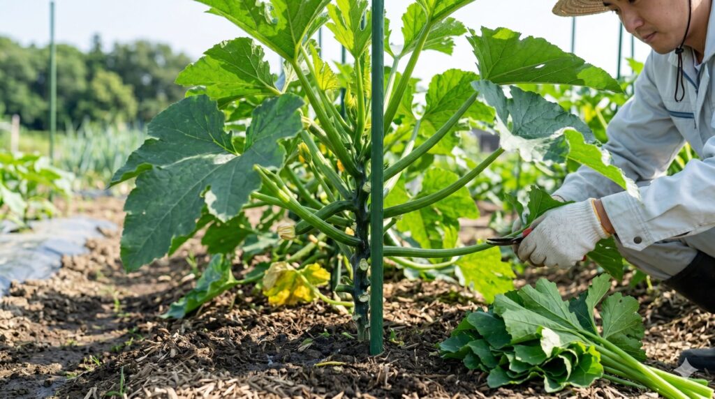 地這い栽培では地面に広がってしまいますが、垂直に立てることで管理が劇的に楽になります。茎が太くなり、自重で倒れそうになる前に支柱に固定してあげましょう。ただし、ズッキーニの茎は非常に折れやすいので注意が必要です。無理に引っ張ったり曲げたりせず、茎の自然な立ち上がりに合わせて支柱を添えるようにします。また、主軸は1本に絞り、余計なわき芽は早めに除去して栄養を集中させることが、立派な実を収穫するための近道ですよ。狭い畑やプランター栽培の方にこそ、この垂直仕立ては最強の味方になります。